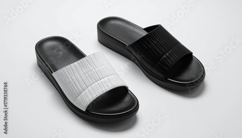 Black and white designer slide sandals with thick soles and dual wide straps, placed on a reflective surface for a sleek, minimalist fashion presentation.