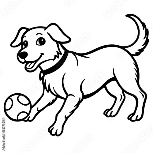 black and white dog with ball line art drawing, isolated on white background