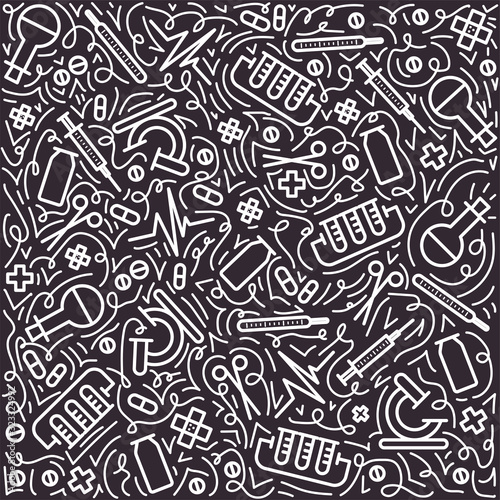 Black and white doodle. Seamless pattern vector concept medical doodles illustration. With place for text. Healthy lifestyle concept. Design for advertising, web sites, posters, print.