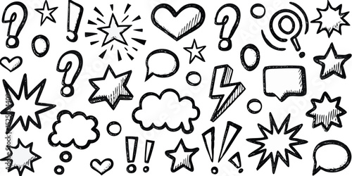 Black and White Doodle Seamless Pattern with Stars, Speech Bubbles, Hearts, and More