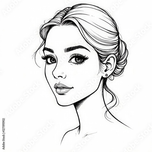 Black and white drawing of a young beautiful girl. Coloring, tattoo, minimalism, business card, website, salon, poster, brochure, postcard, magazine, book