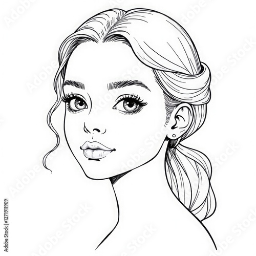 Black and white drawing of a young beautiful girl. Coloring, tattoo, minimalism, business card, website, salon, poster, brochure, postcard, magazine, book