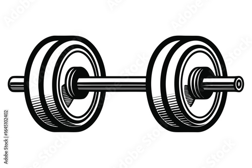 Black and white dumbbell with metal bar and weighted plates against a white space