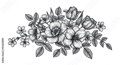 Black and white floral vector illustration: botanical design for print, poster, card in hand drawn style