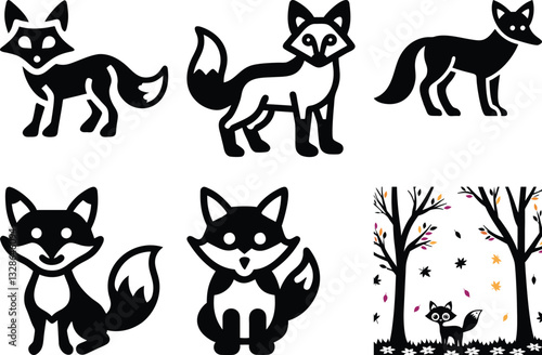 Black and White Fox Illustrations Set: Cute Cartoon Foxes in Various Poses, Vector Art, Woodland Animals, Simple Design