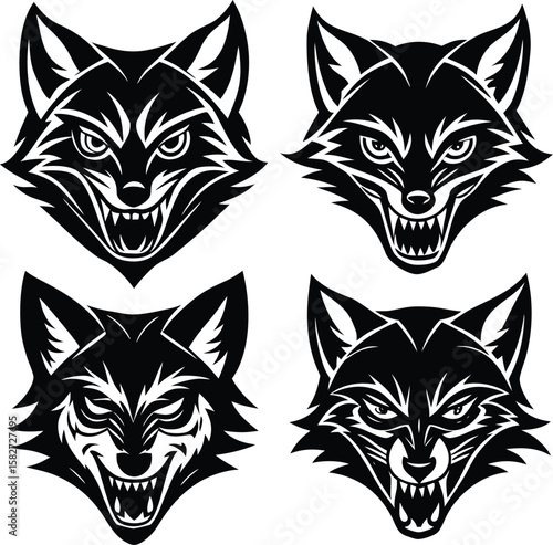 Black and white Fox set, cute cartoon Fox vector illustration with felines, kittens, and domestic animal silhouettes, cartoonish, collection, line, flat, icon