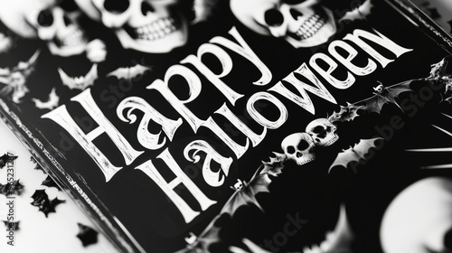 Black And White Halloween Sign With Skulls, Bats, And The Words "Happy Halloween". Perfect For Spooky Season!