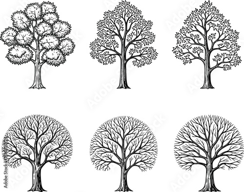 Black and white hand drawn tree illustrations collection showing different styles and leaf textures