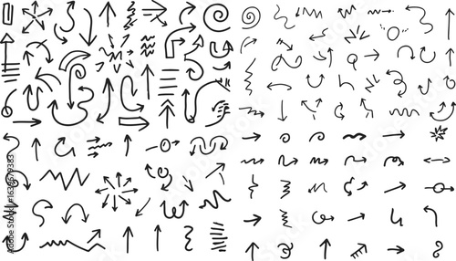 Black and White Hand-Drawn Arrow and Line Icon Set – Decorative and Functional Vector Elements for Diagrams, UI Design, and Creative Projects