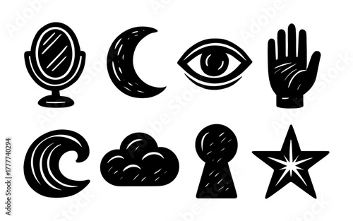Black and white hand-drawn icons set featuring celestial and mystical symbols