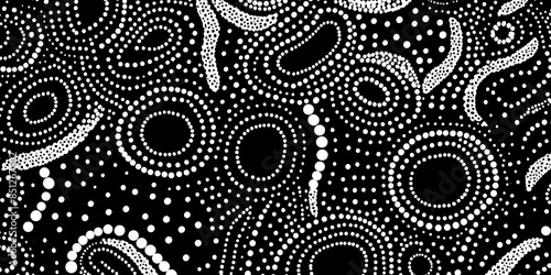 Black and white handdrawn polka dot animal pattern with aboriginal art style. Concept Animal Art, Polka Dots, Black and White, Hand Drawn, Aboriginal Style