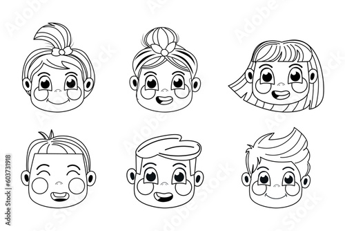 Black and white head avatars of children boys, girls