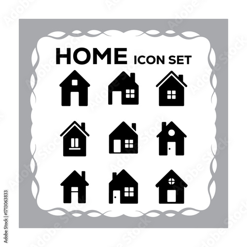 Black and White Home Icon Set with Ornate Border Design Featuring Simple Home Illustrations