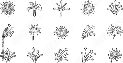 Black and white icon set of fireworks bursts with star shapes and radiating celebratory lines