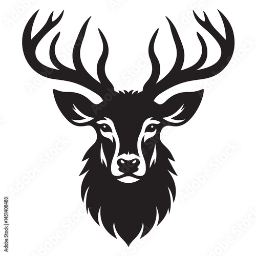 Black and white illustration, deer head silhouette, majestic antlers, minimalist design, elegant profile, stylized wildlife art, sharp contrast, vector graphic style, iconic logo design.