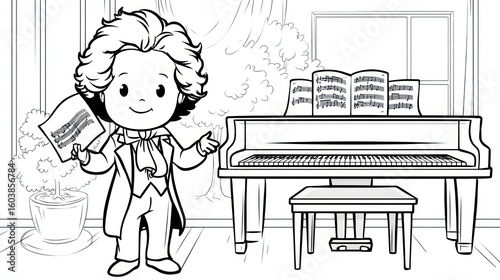 Black and white illustration of a child-like rendition of a composer in a room with a piano
