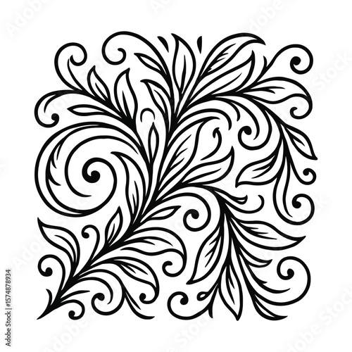Black and White Illustration of a Square Floral Design with Leaves and Swirls