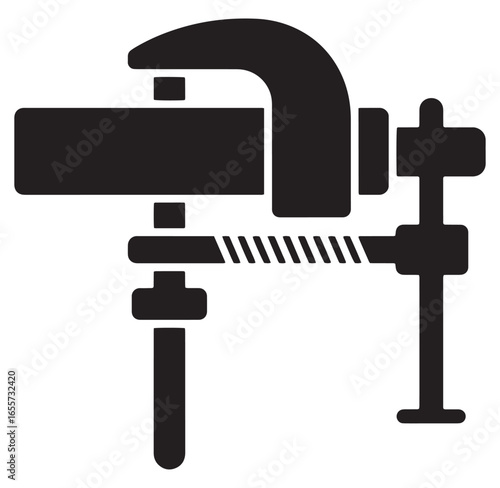 Black and white illustration of a workshop metal clamp tool for woodworking and construction
