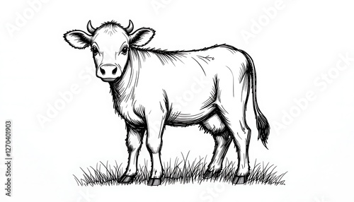 Black and white illustration of a young calf standing in the grass, detailed drawing of a cute cow, farm animal artwork
