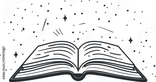 Black and white illustration of an open book with stars, symbolizing imagination and knowledge.