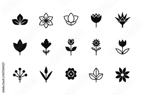 Black and White Illustration of Floral and Foliage Icons, Minimalist Design