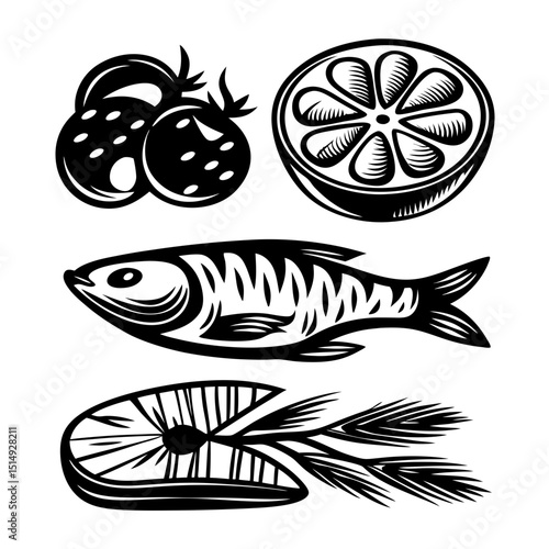 Black and white illustration of healthy food