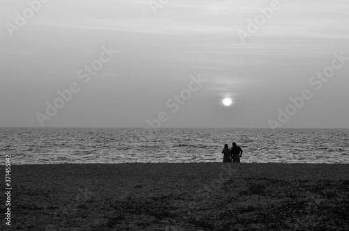 Black and white image of a couple at the beach during sunset