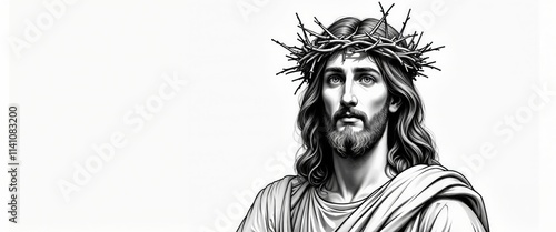 Black and white image of Jesus Christ with a crown of thorns.Sacrifice. Faith. Redemption.Christian symbol, faith, passion, reflection, spiritual message, Christian holidays, religious poster.