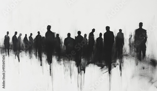 Black and White Ink Drawing of People in Line with Abstract Double Exposure. AI generated illustration