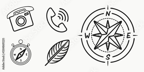 Black and White Line Art Icons: Rotary Phone, Receiver, Compass, Feather, Compass Rose - Vintage Style Graphics