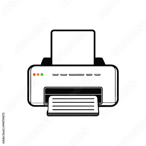 Black and white line art illustration of a printer with a paper sheet coming out of the tray.