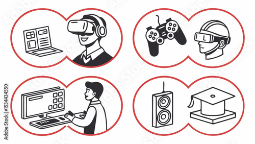 Black and white line art illustration of modern digital technology featuring VR gaming computers education entertainment