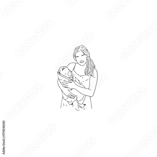 Black and white line art of a beautiful mother lovingly embracing her baby minimalist tender illustration