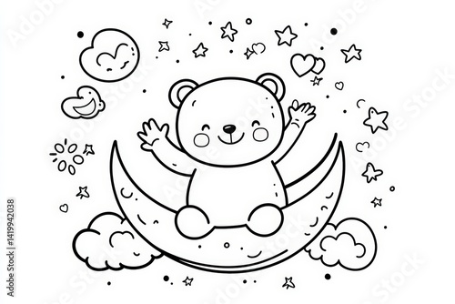 Black and white line art of a cute cartoon bear sitting on the moon, surrounded by clouds, stars, and hearts in a night sky. Adorable kids coloring page or bedtime theme art.