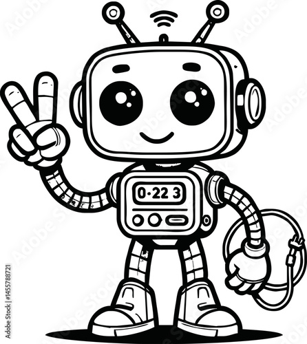 black and white line art vector cartoon friendly robot isolated for coloring page.A robot cartoon cute fun alien mascot character man illustrations