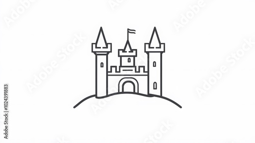 Black and White Line Drawing of a Castle with Two Towers and a Flag on Top