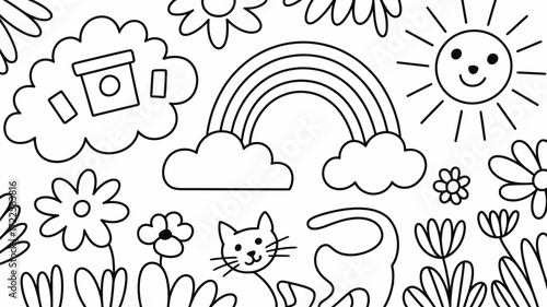 Black and White Line Drawing of Cat, Rainbow, Flowers, and Coffee Cup | Whimsical Cartoon Illustration of Cat with Rainbow and Sunshine | Cute Line Art Scene with Cat, Coffee, and Flowers