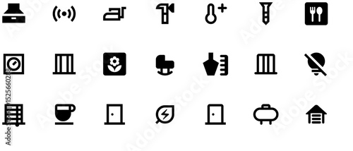 Black and white minimalist energy education app icons featuring windows, heaters, vents, lights, and home silhouette, arranged in two rows with clean vector design on white background.