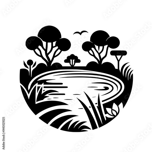 Black and White Minimalist Landscape Illustration of Pond, Trees, and Birds in Circular Silhouette Style