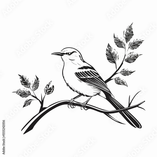 Black and white Northern Mockingbird Sitting In Tree image vector isolated on white background.