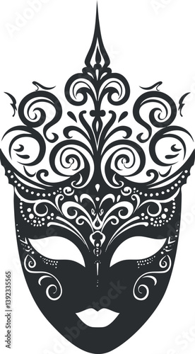 Black and white ornate masquerade mask illustration with intricate floral and filigree patterns.