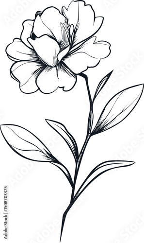 Black and white outline of a blooming flower with leaves, botanical sketch. Vector illustration