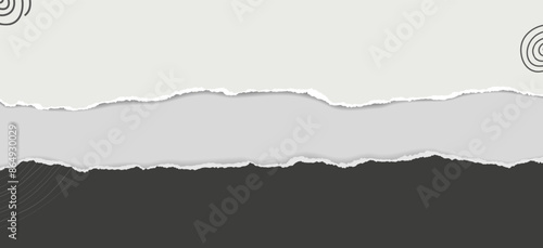 Black and white paper strips with torn edges and soft shadow are on grey background for text or ad.