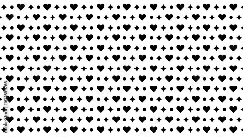 Black and white pattern featuring hearts stars and dots arranged in a repeating design layout