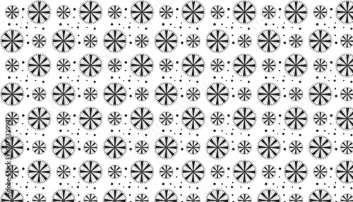 Black and White Pattern of Starbursts and Dots on White Background abstract repeating