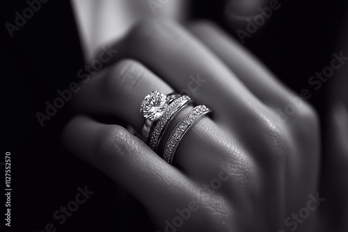 black and white photo of a woman's hand with beautiful rings on her finger, close-up