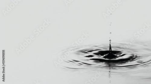 Black and white photograph of a single drop of water falling into a pool of water. the drop is in the center of the image, with the water rippling around it in a circular pattern.