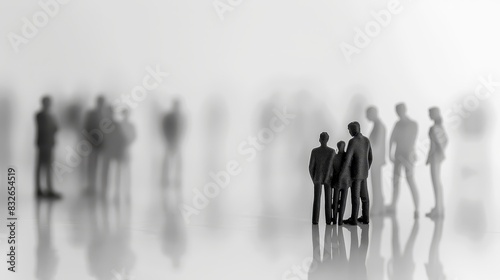Black and white plastic figurines of people placed randomly, representing societal dynamics (selective focus, society theme, surreal, overlay, abstract backdrop)