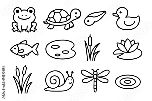 Black and white pond animal outlines: frog, turtle, duck, fish, snail, dragonfly