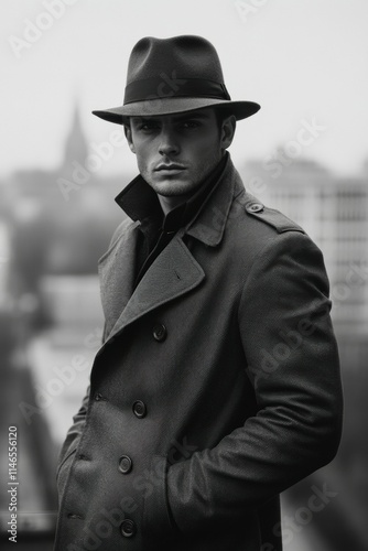 Black and white portrait of a man in a trench coat and fedora, with a cityscape in the background